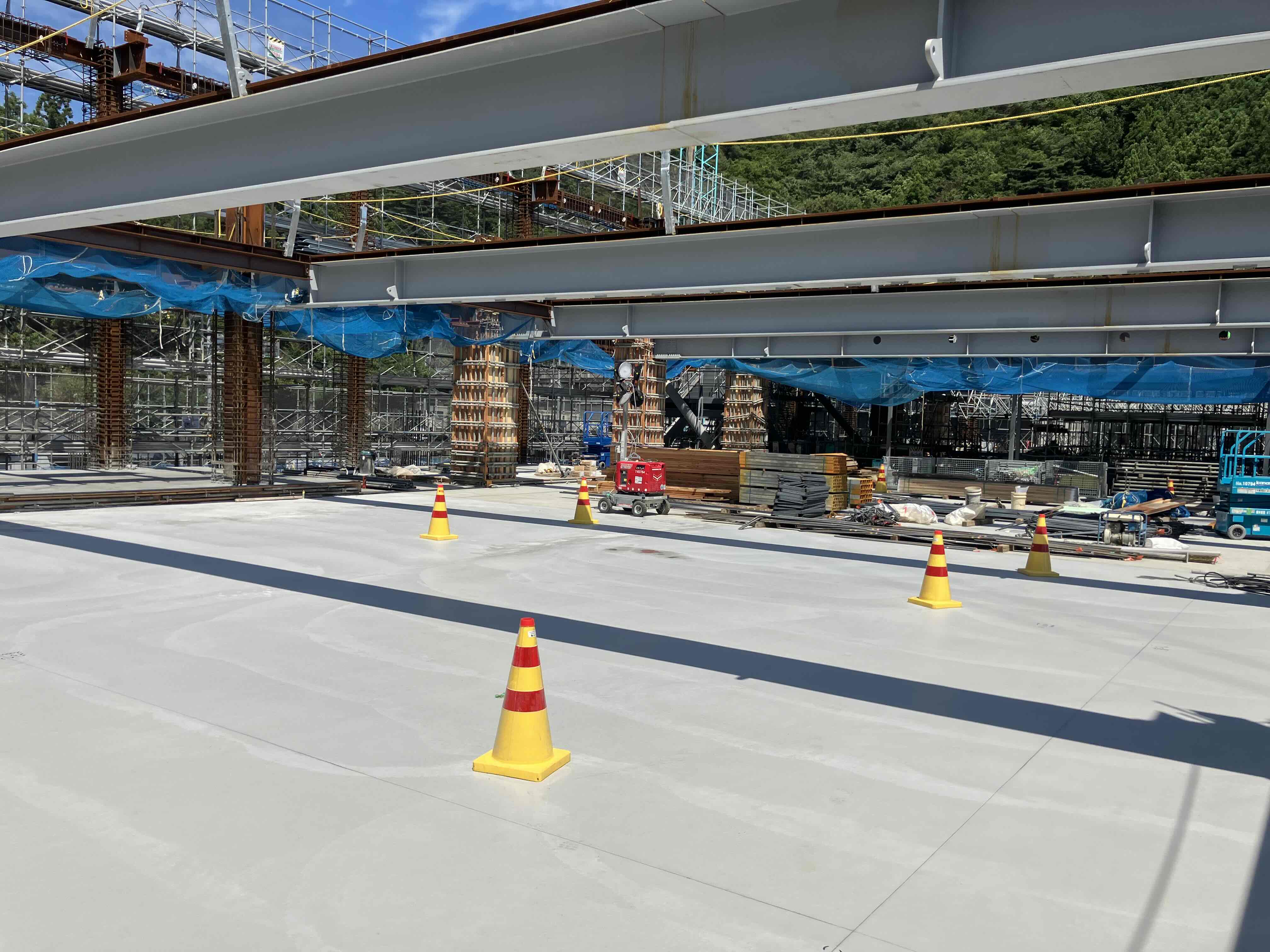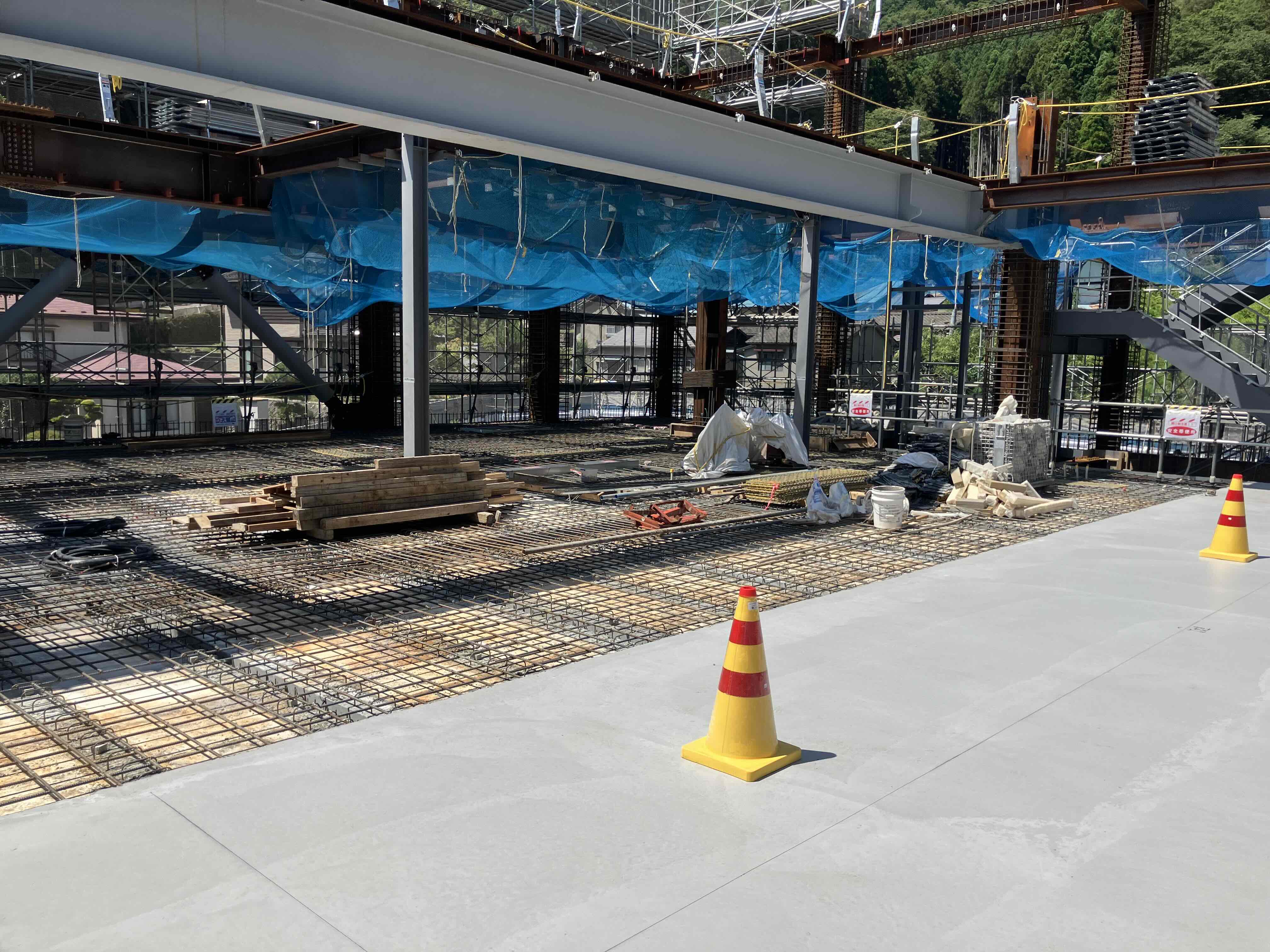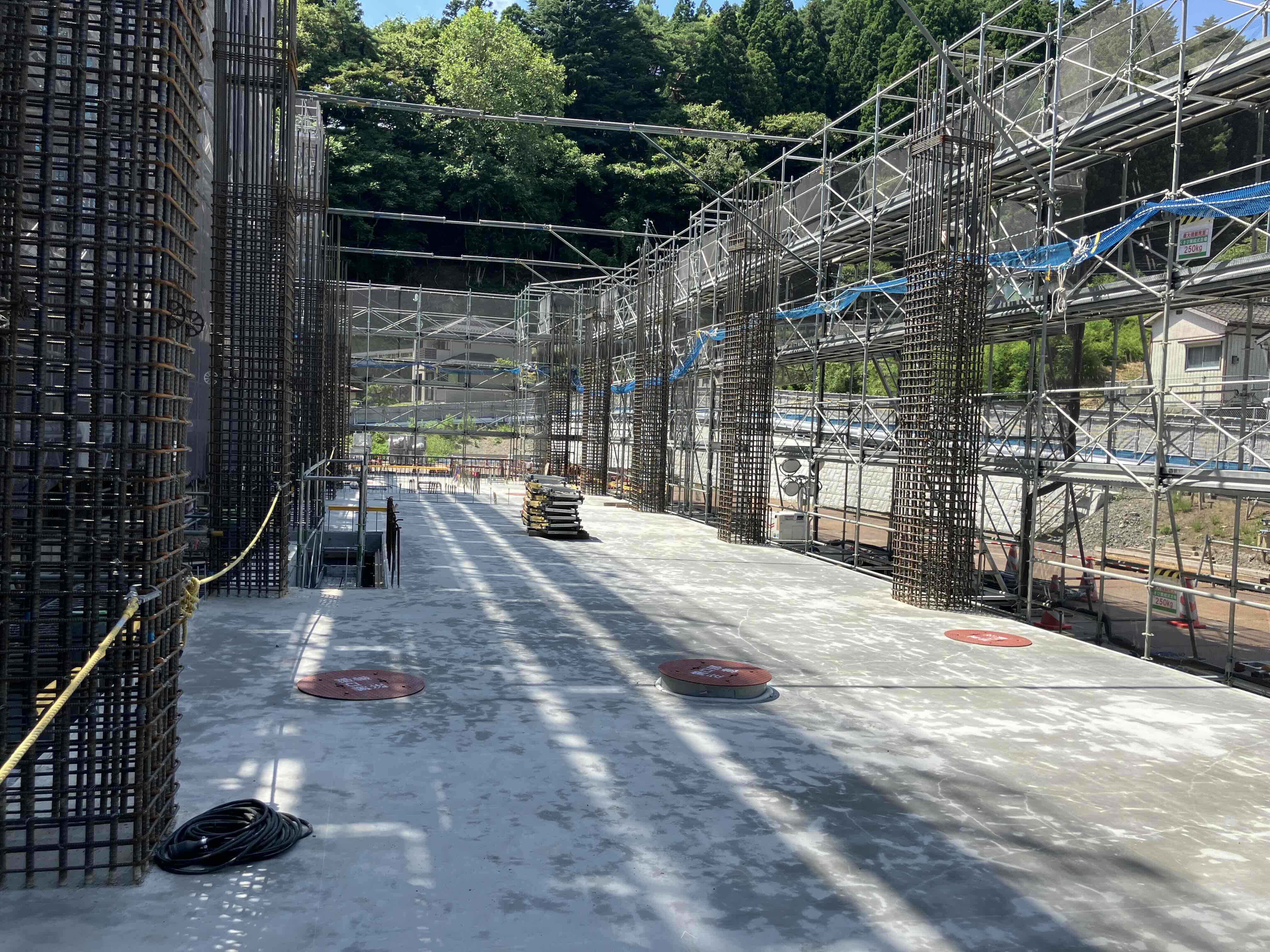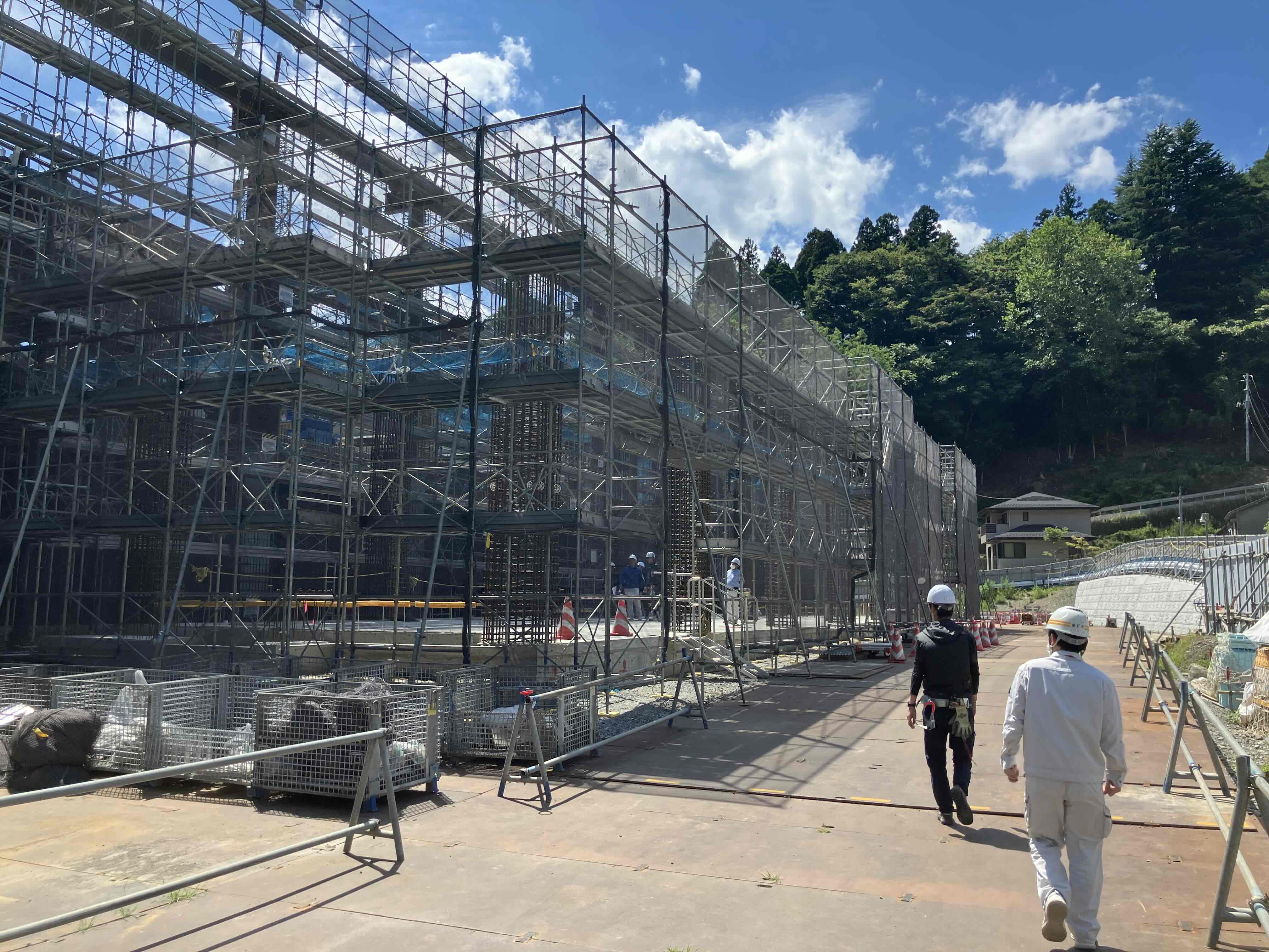 車庫棟の足場が設置され、内部は1階床スラブの打設が完了しました。