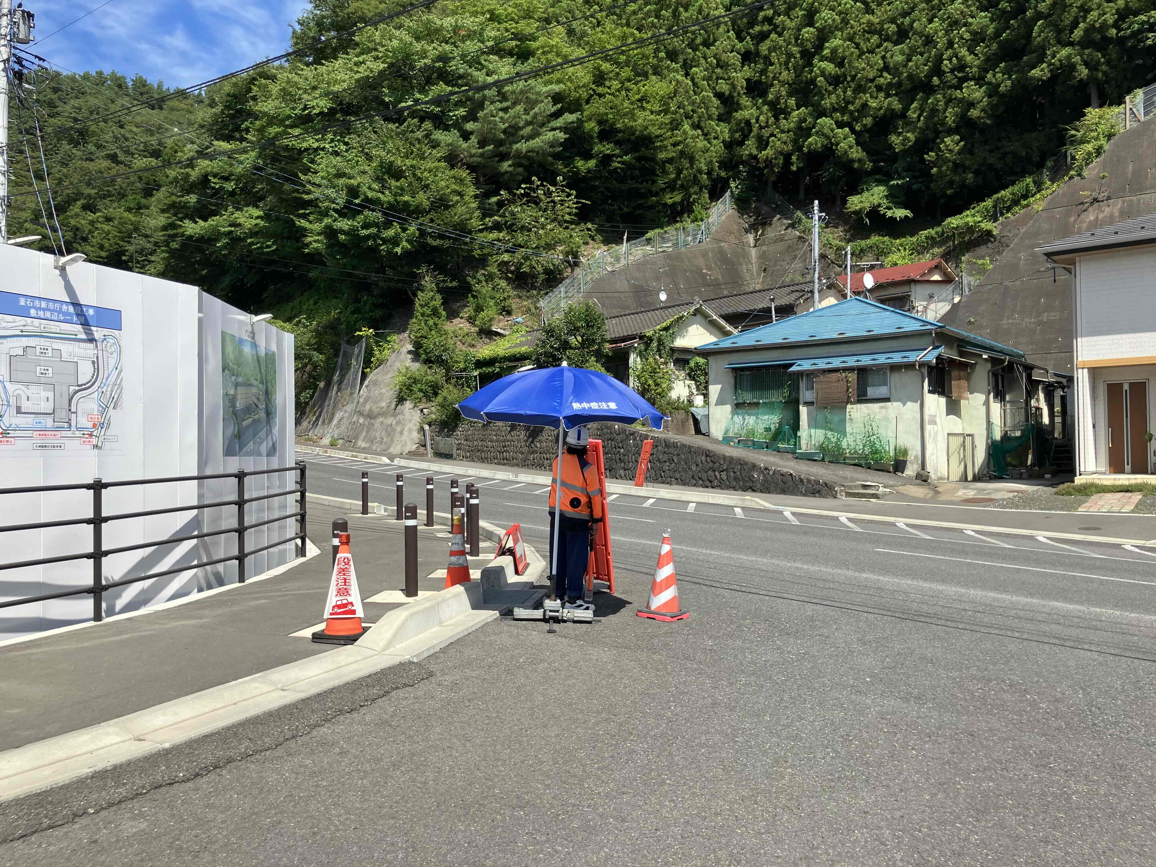 交通誘導の位置にも日除けを設け、暑さ対策を行っております。