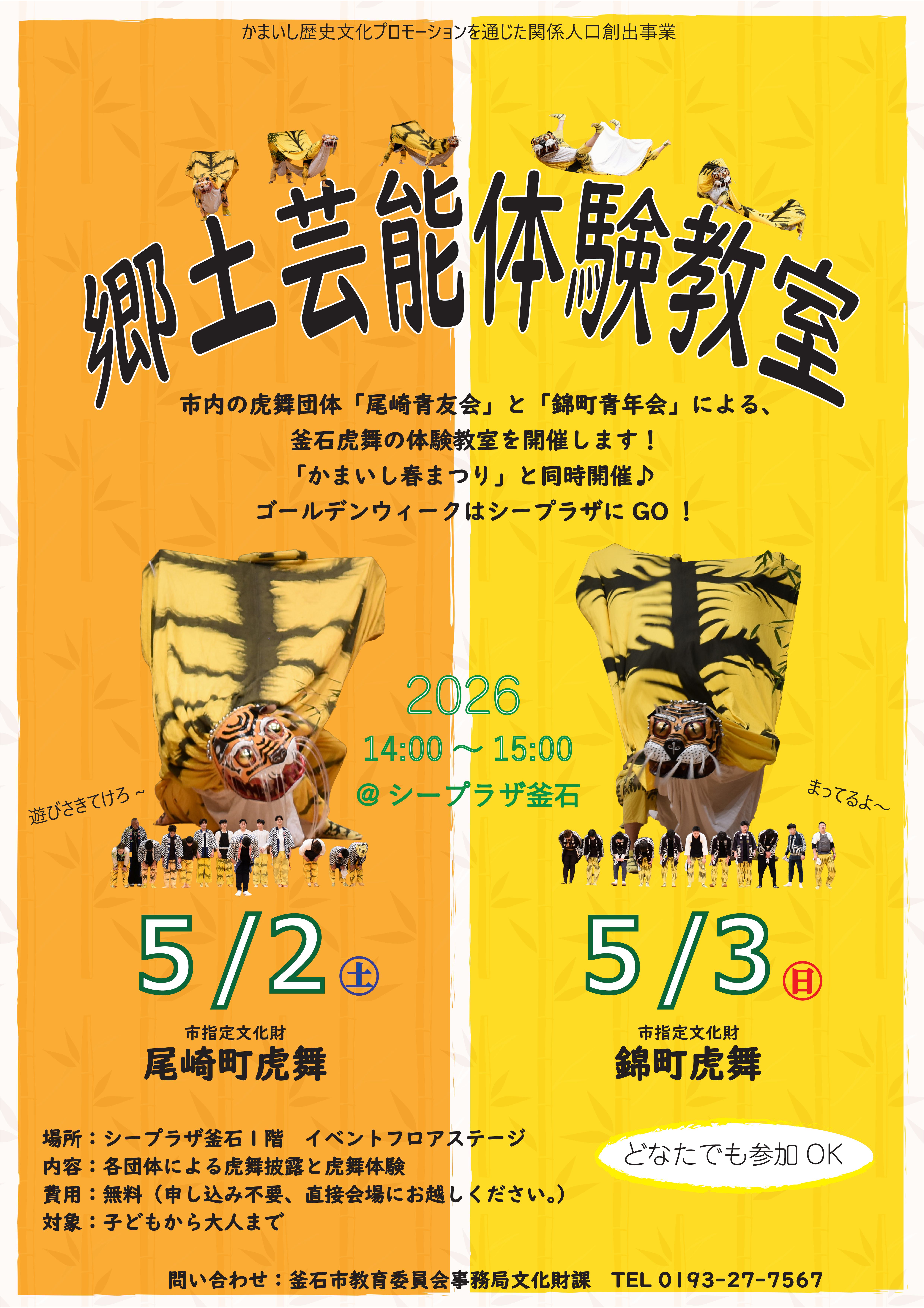 かまいし春まつりとの同時開催として、郷土芸能体験教室を開催します。