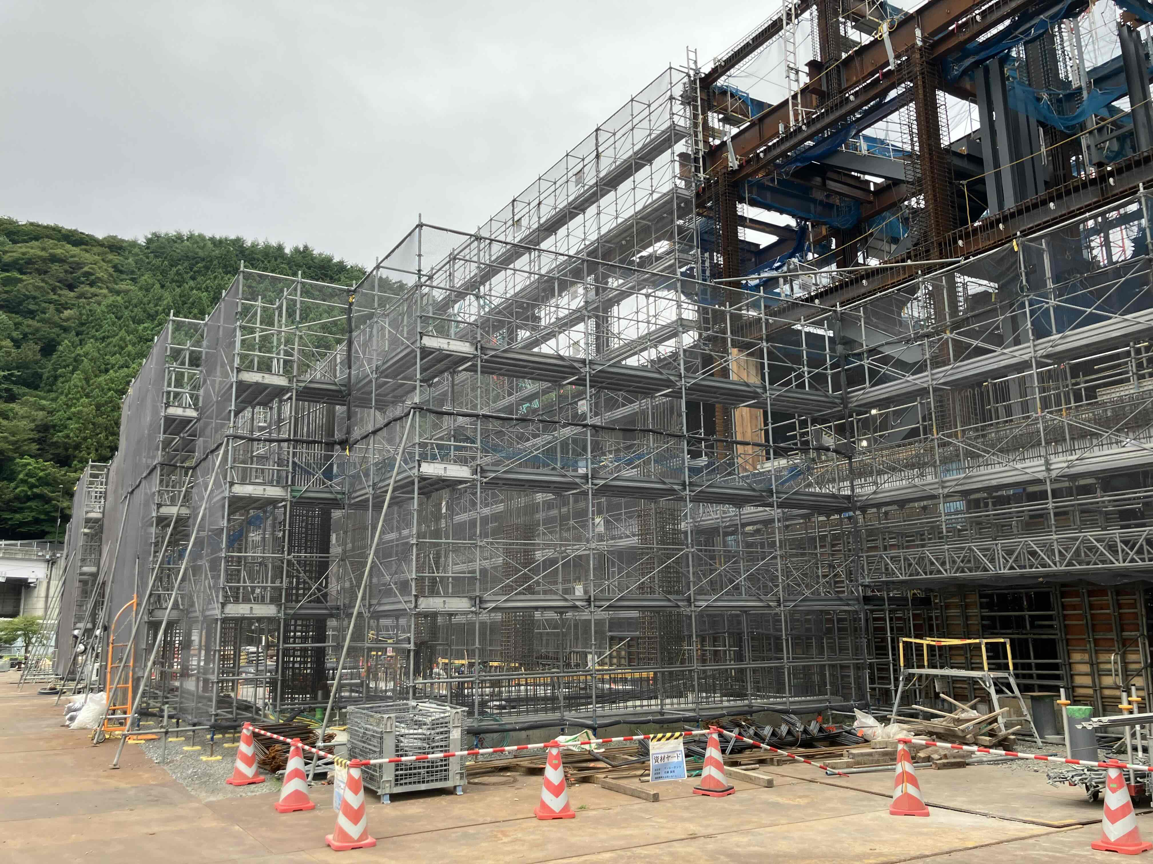 車庫棟の足場内では柱の配筋工事が進められております。