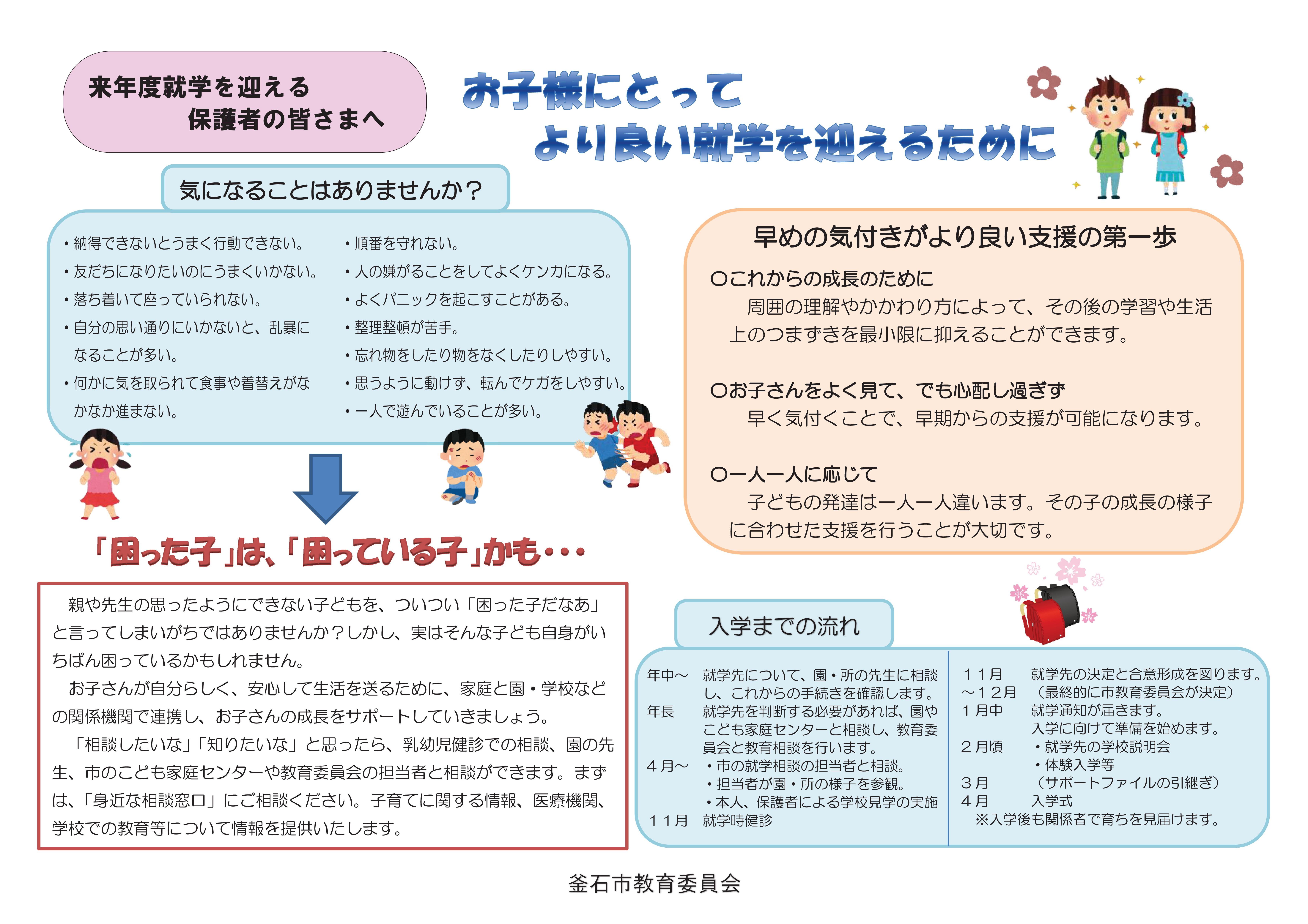 お子様にとってより良い就学を迎えるために、市と市教育委員会における特別支援教育の概要についての理解を図る就学支援リーフレットを作成しています。