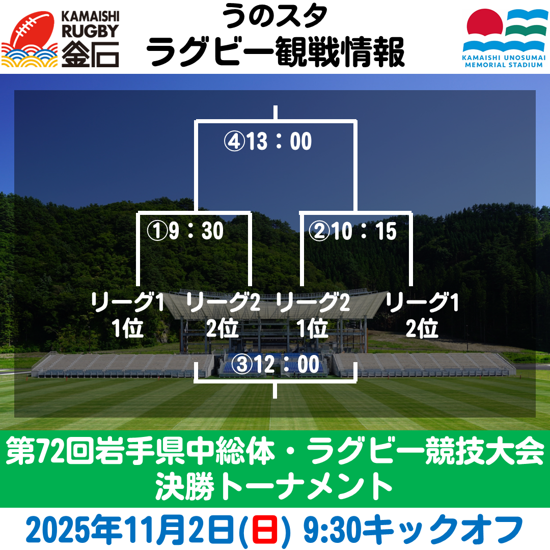 第72回岩手県中学校総合体育大会 第42回ラグビーフットボール競技大会の予選が2025年11月1日(土)に釜石市球技場にて、決勝が11月2日(日)に釜石鵜住居復興スタジアムにて開催されます。
