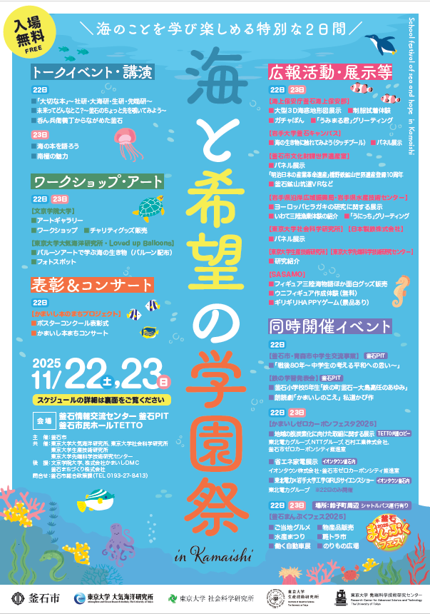 「海と希望の学園祭in kamaishi」を11月22日(土)、23日(日)の2日間、釜石情報交流センター釜石PITと釜石市民ホールTETTOで開催します。
