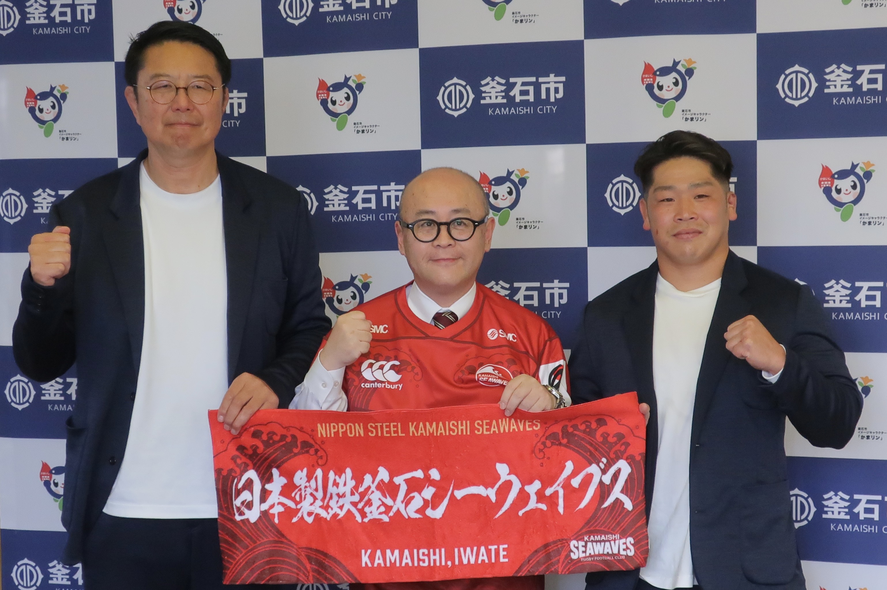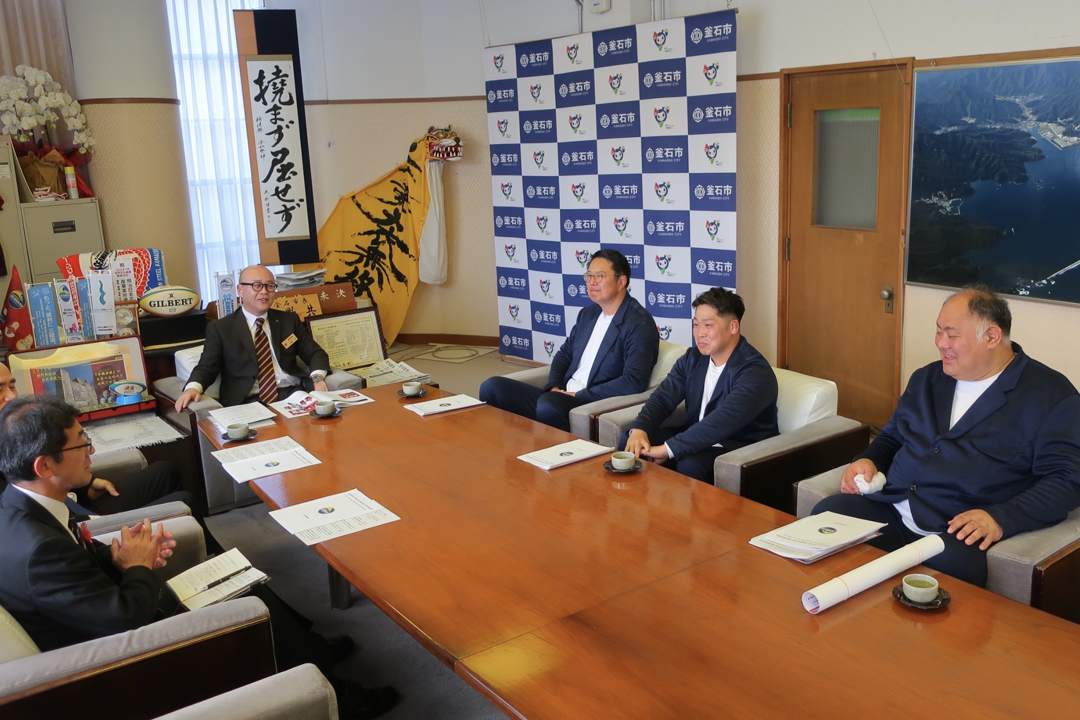 日本製鉄釜石シーウェイブスの桜庭吉彦GMら3人が12月1日、2025-2026シーズン開幕にあたり小野共市長を表敬訪問しました。