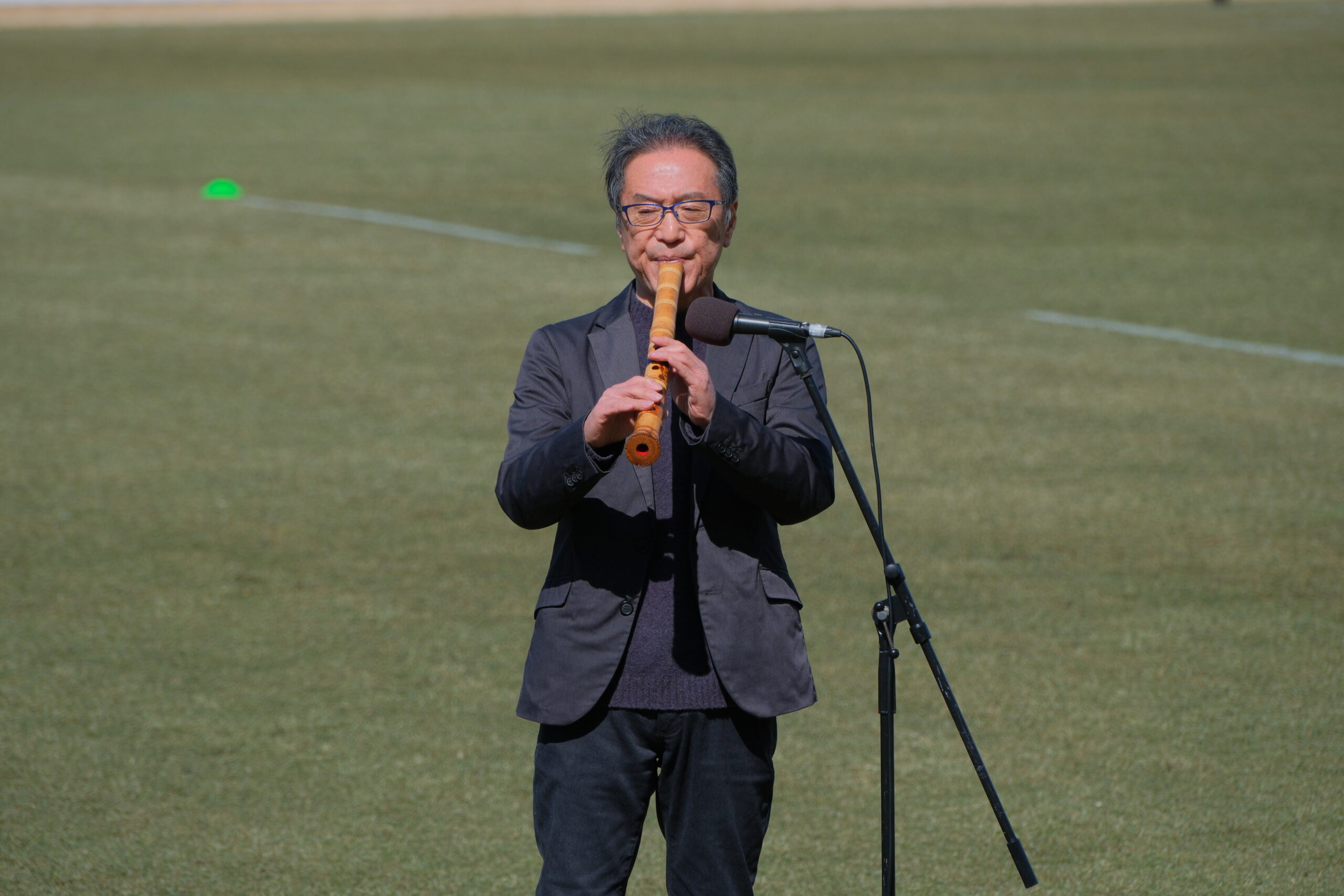 尺八の音色と、シーウェイブス応援団で民謡歌手の佐野よりこさんのミニライブ