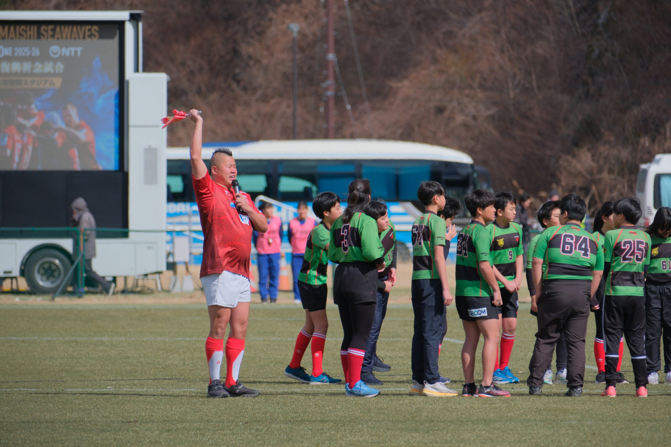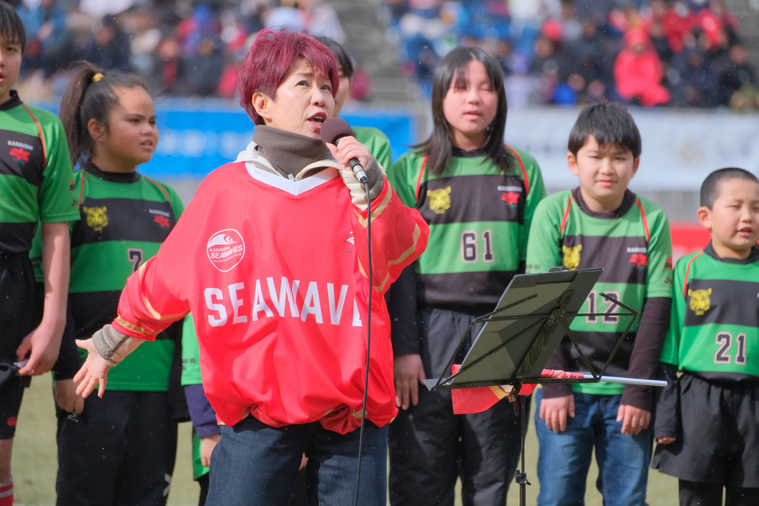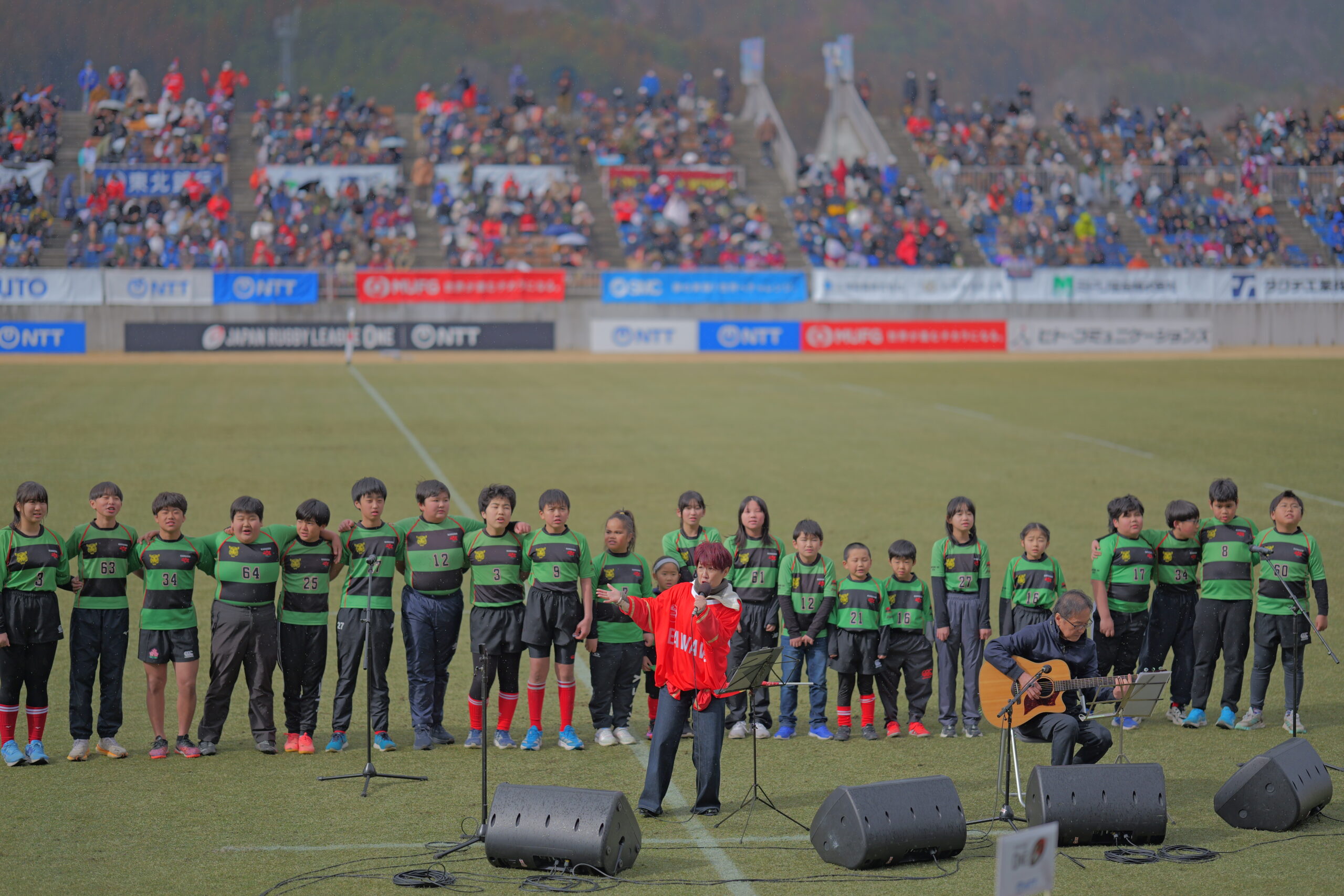 ハーフタイムには、佐野よりこさんと釜石シーウェイブスジュニアの子供たちが「ありがとうの手紙 ♯Thank You From KAMAISHI」を歌いました