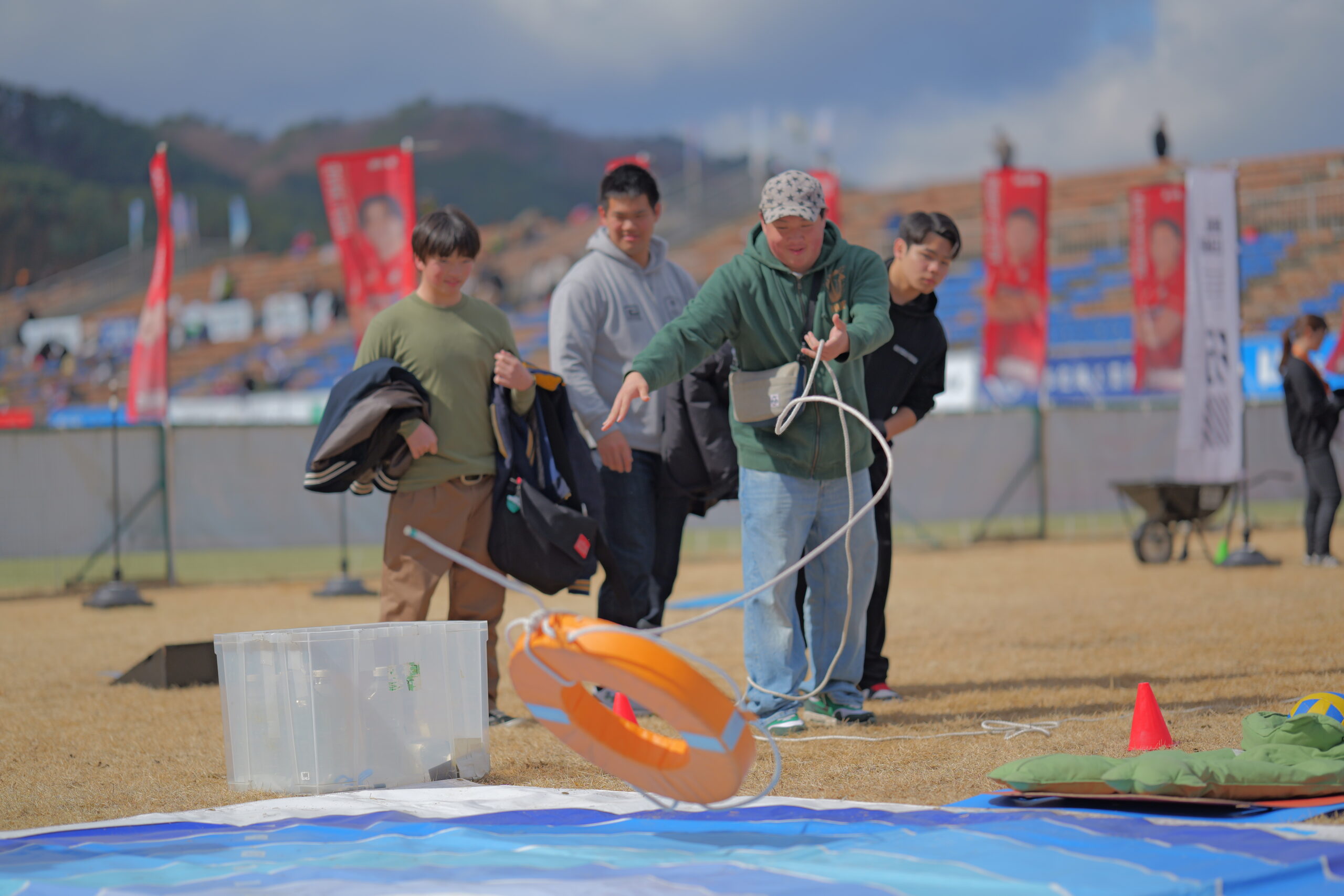 災害時に水難者を発見した時には、正しい救助が必要です。身の回りにある浮くものとロープを川や海で溺れている人に投げいれ、岸まで引っ張り救出するまでの早さと性格さを競う競技です。