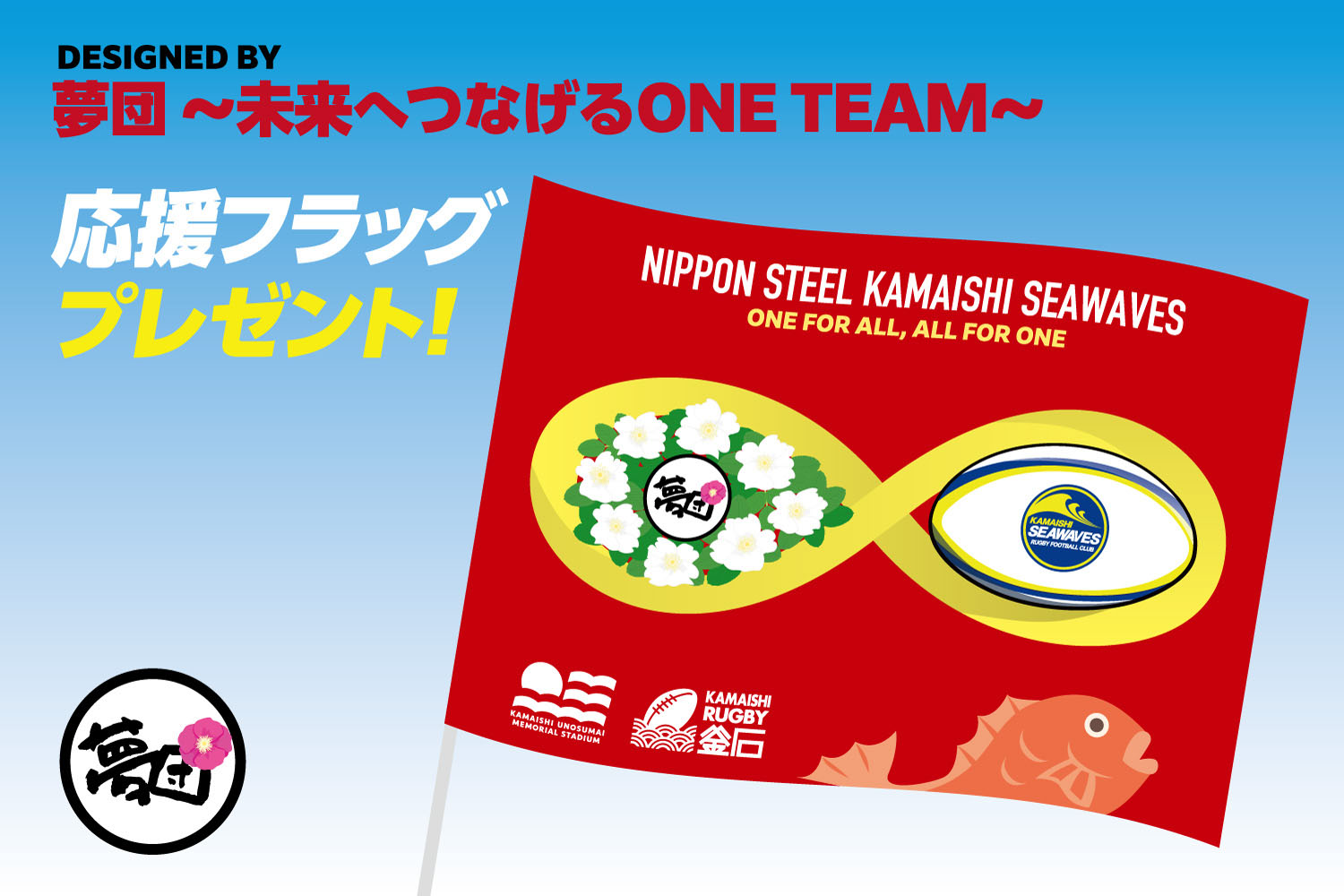 フラッグ中央の無限マークには「繋がり」と「永遠」への想いを込めています。右側の円はラグビーボールで埋め、その中心にシーウェイブスのロゴを配置。左側には夢団のロゴを置き、その周囲を白い花で彩りました。震災により大きな被害を受け、震災後の6月に数本が美しく咲き、鵜住居地区の復興の象徴となった「ハマナス」をイメージしています。