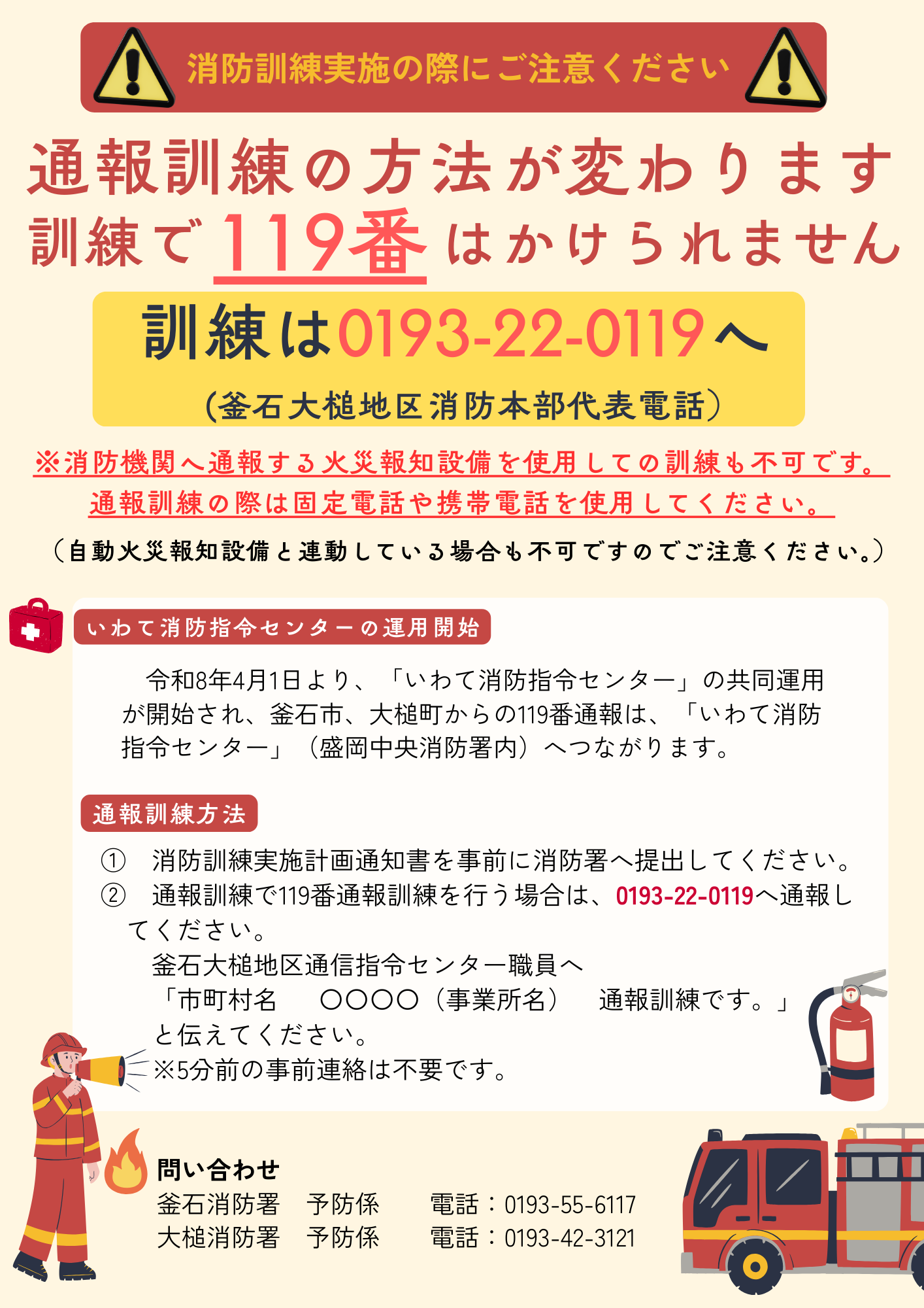 そのため、通報訓練を行う際は、0193-22-0119(釜石大槌地区消防本部代表電話)へお願いします。