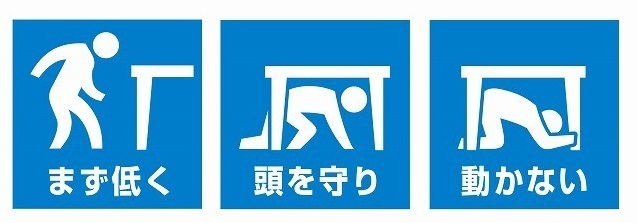 - 頭を守る :机の下に入ったり、腕やカバン等で頭を覆う等、落下物から身を守ります