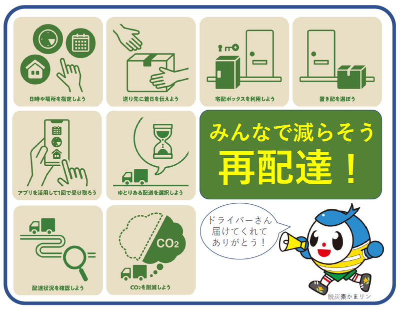 再配達を減らすことは、結果的に温室効果ガスの削減につながり、地球温暖化の対策となります。