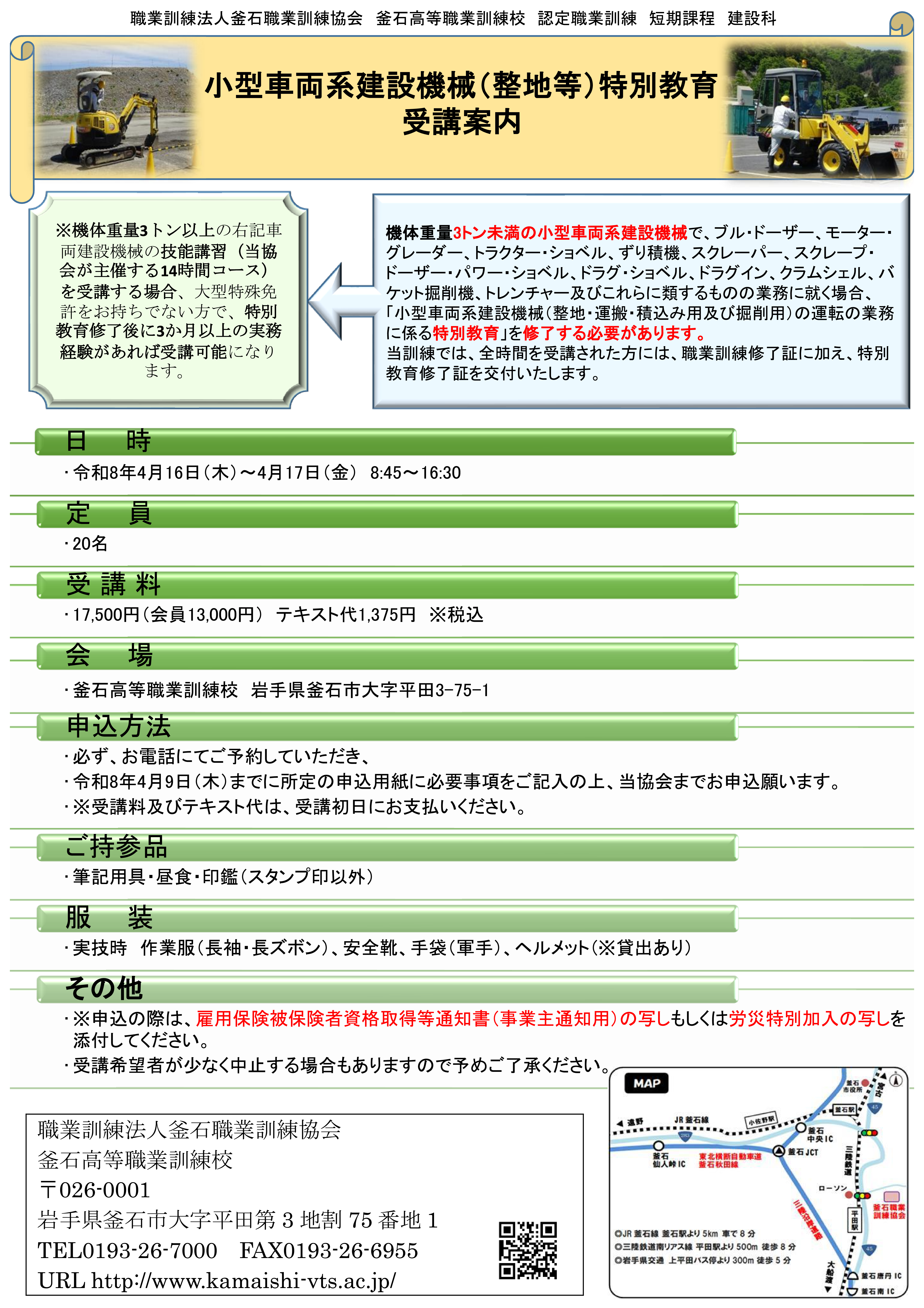 ◆4月16日(木)~17日(金) 小型車両系建設機械 (整地等)特別教育 | 職業訓練法人釜石職業訓練協会公式ホームページ (kamaishi-vts.ac.jp) (外部リンク)