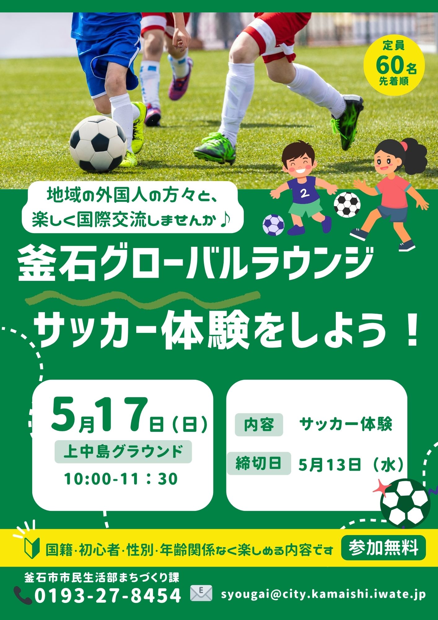 市内在住外国人と日本人市民の交流を目的として、釜石市国際交流協会と共催で定期的に釜石グローバルラウンジを開催しています。今回は、サッカー体験を通して楽しく体を動かしながら交流を行います。国籍、性別、年齢、未経験でも、どなたでもご参加できます!みなさまのご参加をお待ちしております!
