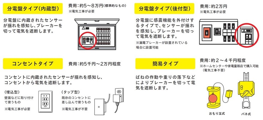 感震ブレーカーには、4つのタイプ(分電盤タイプ(内蔵型、後付型)、コンセントタイプ、簡易タイプ)があります。製品ごとの特徴・注意点を踏まえ、適切に選びましょう。