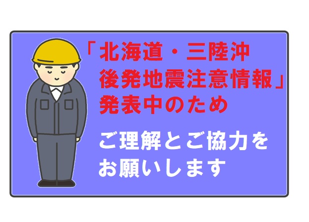 4月20日(月)午後4時53分ごろに三陸沖を震源とする地震が発生したことに伴い、「北海道・三陸沖後発地震注意情報」が発表されているため、岩手沿岸南部クリーンセンターの3階浴場の開放を4月21日~4月27日までの期間見合わせます。