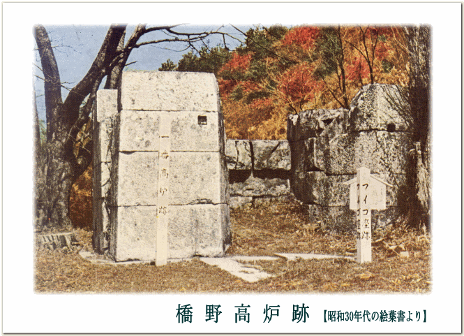 紅葉の季節に合わせて公開した 絵葉書です。 橋野高炉跡は昭和32年に 国指定文化財となっているため、 その頃に撮影された写真を もとにして作成されたものと 思われます。 |