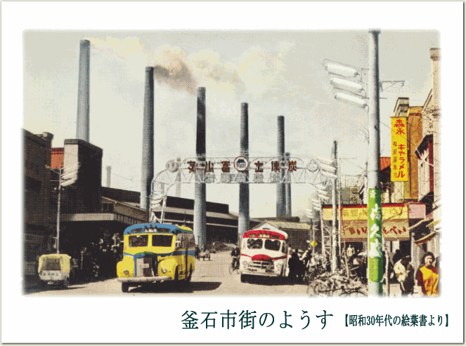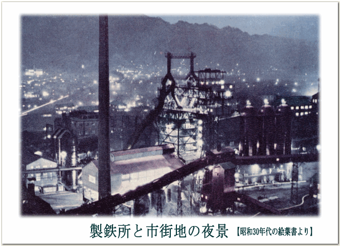 昭和30年代の絵葉書です。 大渡町から製鉄所方面を望む 写真をもとにつくられており、 現在はなくなってしまった 練炭の看板や製鉄所の煙突、 ボンネットバスが見られるなど なつかしさを感じる一枚です。 |