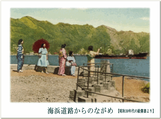 昭和30年代の絵葉書です。 当時、大平地区は観光地として 整備されており、 海岸道路はドライブコースとして 利用されていたとのことです。 |