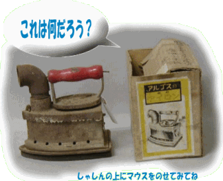 これがなんだかわかるかな? やかんににているけれど・・・・。 これは炭火アイロンなんだよ。むかしの人は炭をつかってせんたく物のしわをのばしていたんだんだよ。 けど、とても重そうだね。 このアイロンは鉄でできていたので、とても重かったんだ。もちろん、今は電気をつかってアイロンをかけられるから、ずいぶん楽になったんだよ。 もどる
