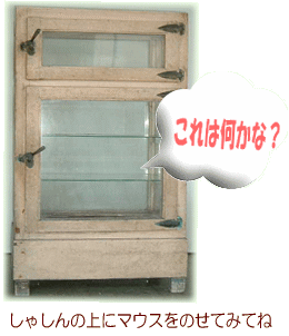 これはなんですか? これはむかしのれいぞうこだよ。上のほうに氷を入れて、中のものをひやしていたんだ 今のれいぞうこは電気の力でひやしているよね。むかしは電気がなかったから、氷でひやしていたんだね。 もどる