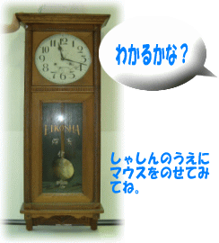 これは時計みたいだけど・・。 そうだよ。これはむかしの時計だよ。 この時計は電池ではなく、ぜんまいを巻いて動かしているんだよ。下についているのが「ふりこ」といって、このふりこが秒針のやくめをしているんだよ。 へぇ〜、そうなんだ!今は、デジタル時計もあるんだよね。 もどる