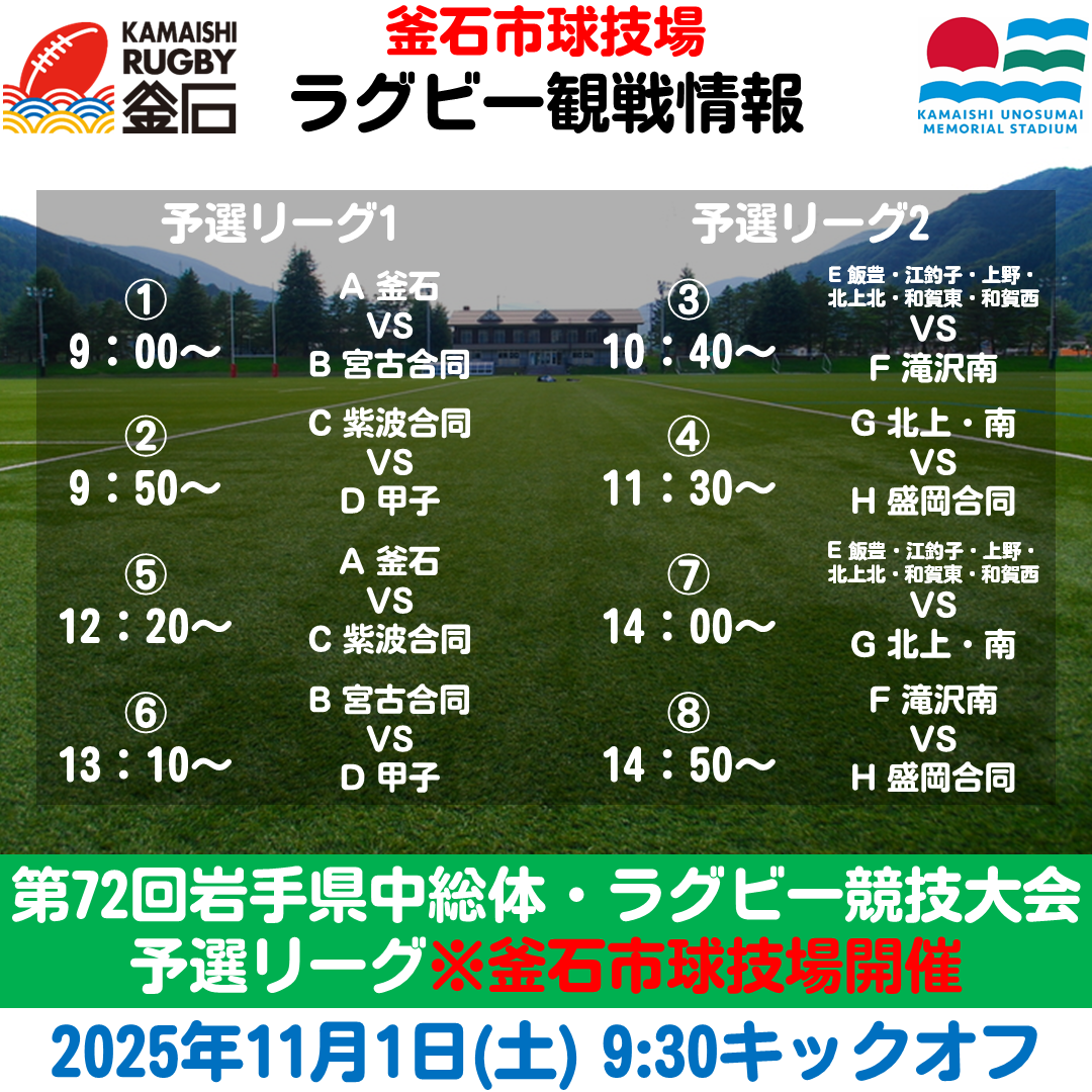 | 文化・スポーツ施設 |  | 【終了しました】第7回釜石市小学校対抗タグラグビー大会【釜石東ロータリーカップ2025】【11/16(日)】 | 表示 |