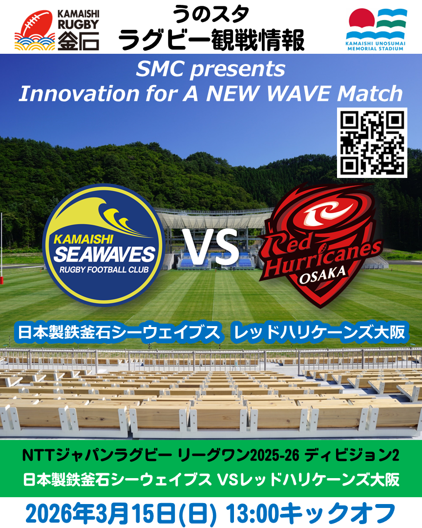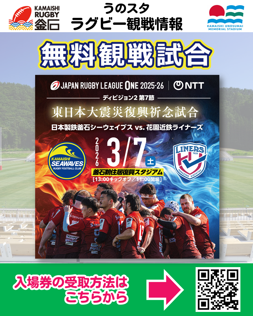 | 文化・スポーツ施設 |  | 【3月7日(土)うのスタ】日本製鉄釜石シーウェイブス VS 花園近鉄ライナーズ【無料観戦試合】 | 表示 |