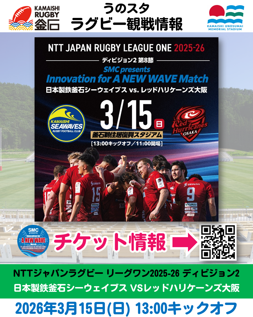 | 文化・スポーツ施設 |  | 【3/15(日)うのスタ】日本製鉄釜石シーウェイブス VS レッドハリケーンズ大阪【チケット販売中】 | 表示 |